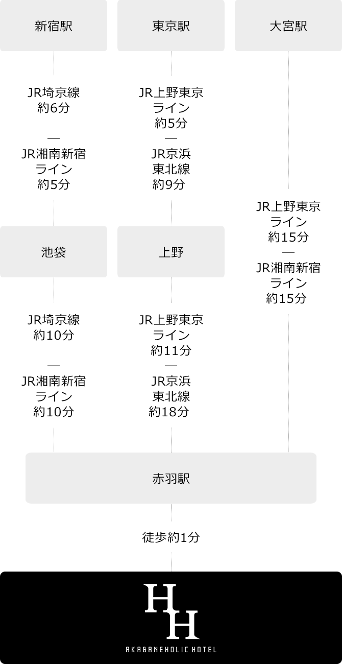 ・羽田空港から東京モノレールで浜松町駅まで約23分、浜松町駅から京浜東北線で赤羽駅まで約34分